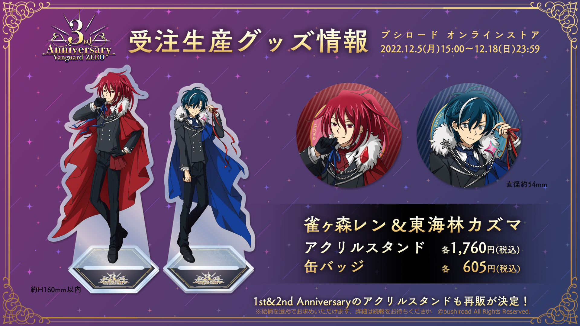3周年キービジュアルを使用した雀ヶ森レンと東海林カズマの「アクリルスタンド」「缶バッジ」が登場!
