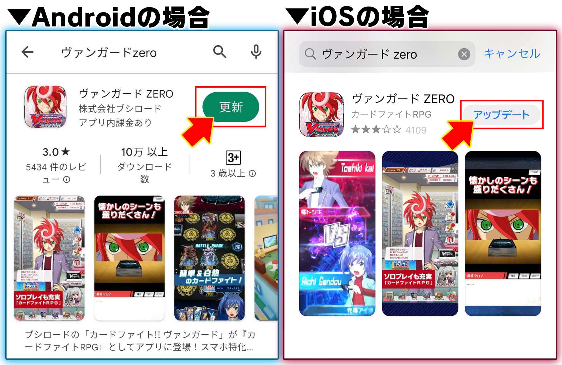 Play Storeから、「ヴァンガード ZERO」を検索し、【更新】ボタンを押す。