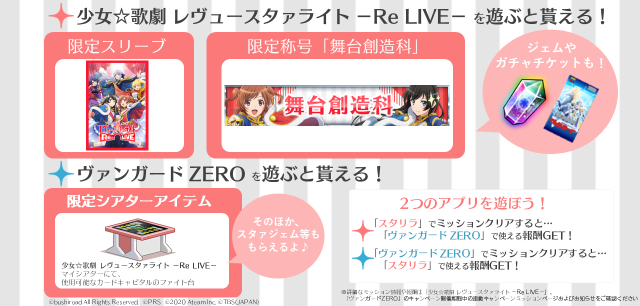 この機会に、「少女 ☆歌劇 レヴュースタァライト −Re LIVE−」と「ヴァンガードZERO」どちらもを遊んで、豪華報酬をGETしよう!