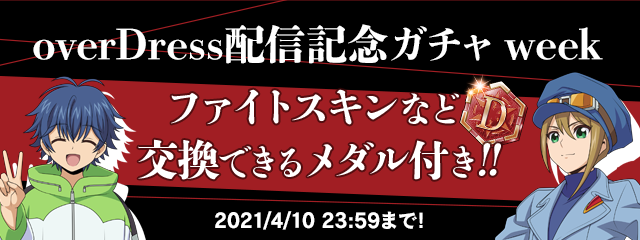 「overDress配信記念ガチャ week」では、1000ジェム10連で最新弾のガチャを引くと、新作アニメ「カードファイト!! ヴァンガード overDress」のキャラクター近導ユウユ(CV.蒼井 翔太)&大倉メグミ(CV.進藤 あまね)のZERO描きおろし&撮りおろしボイス付きファイトスキンと交換できる「Dメダル」を10枚をプレゼント!