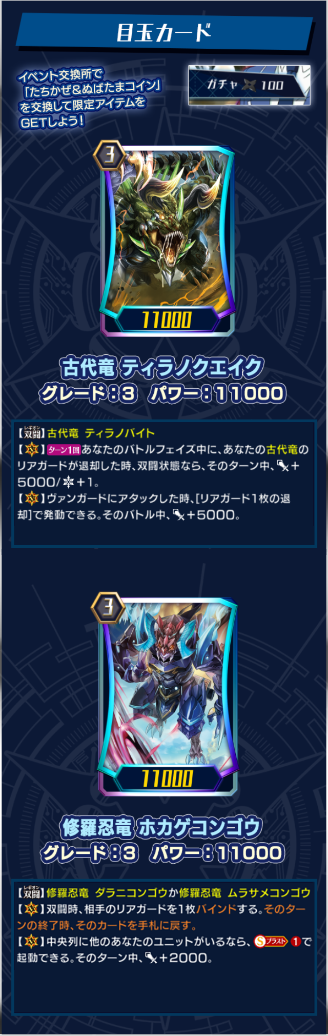 イベントページでは「古代竜 ティラノクエイク」や「修羅忍竜 ホカゲコンゴウ」などのカードが入手出来るガチャを開催中です。