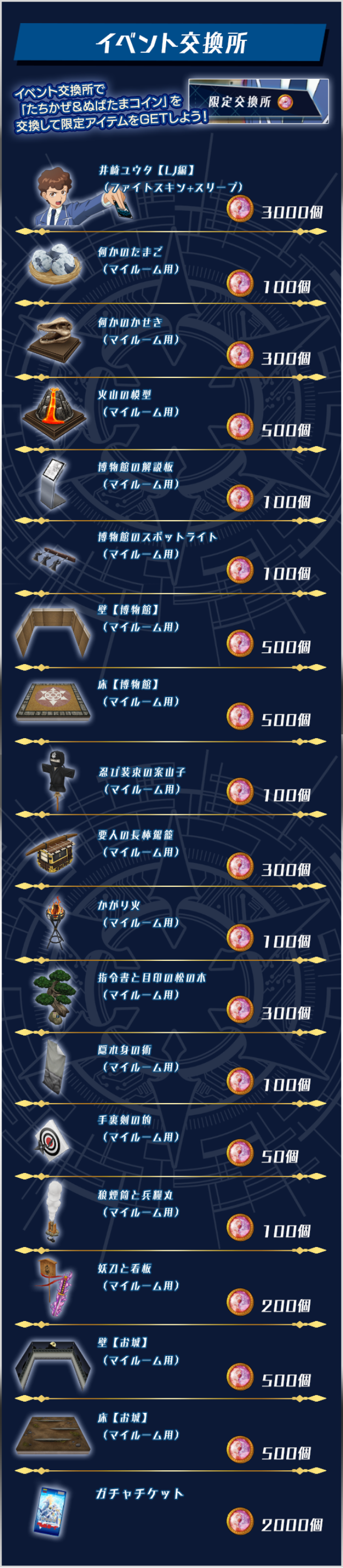 交換所では「たちかぜ&ぬばたまコイン」と引き換えにマイルーム家具が獲得できます。
