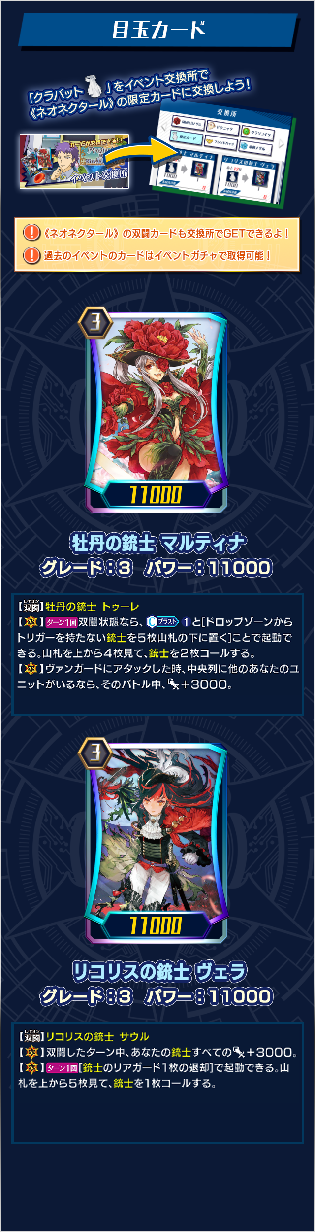「牡丹の銃士 マルティナ」や「リコリスの銃士 ヴェラ」、双闘カードなどのカードが交換可能!