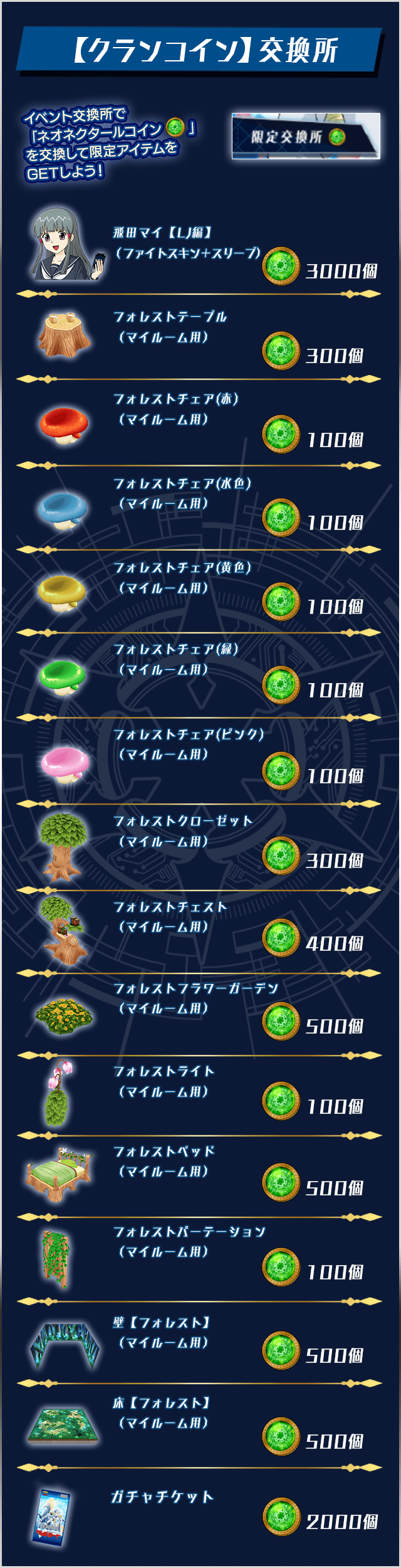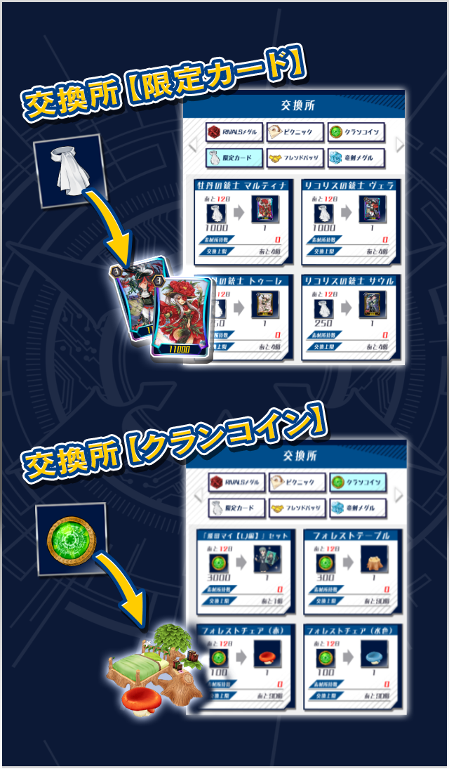 【限定カード】交換所では「クラバット」と引き換えに今回新規で追加される《ネオネクタール》の限定カードが獲得できます。また、【クランコイン】交換所では「ネオネクタールコイン」と引き換えにマイルーム家具が獲得できます。