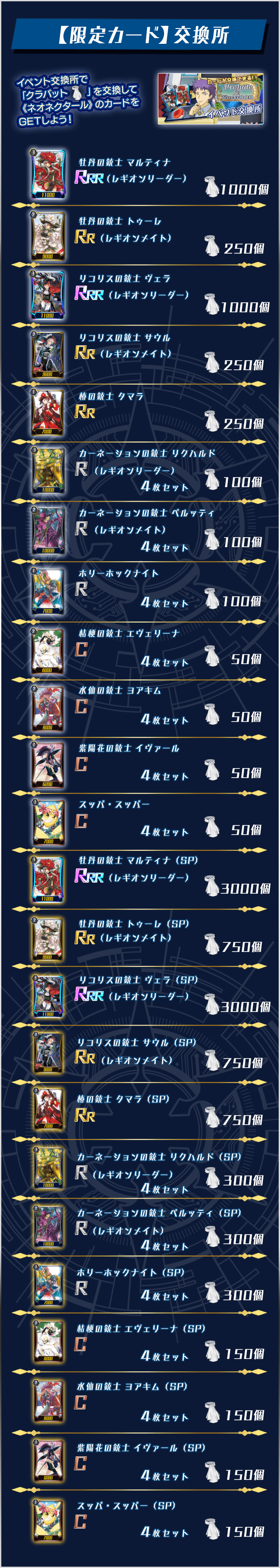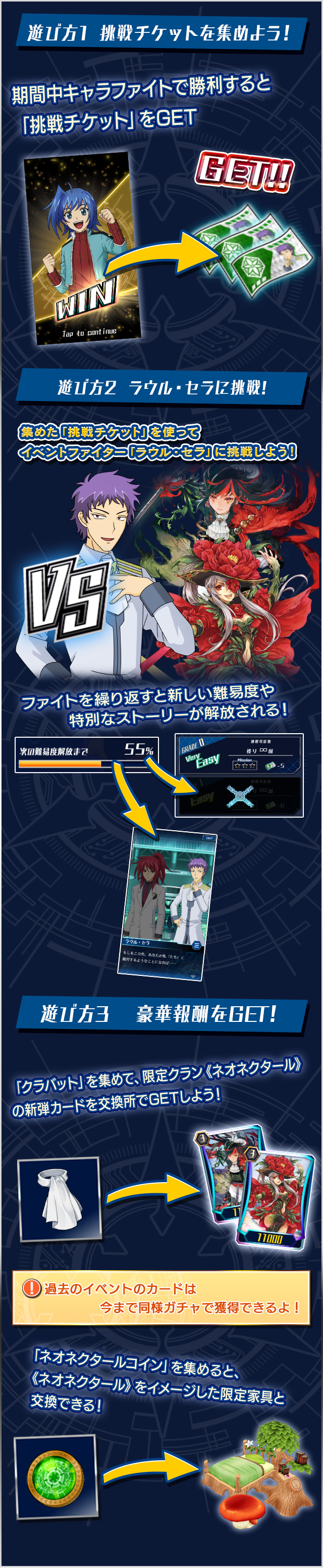 イベントページのガチャでは「クラバット」と引き換えに過去の《ネオネクタール》イベントの限定カードを獲得できます。