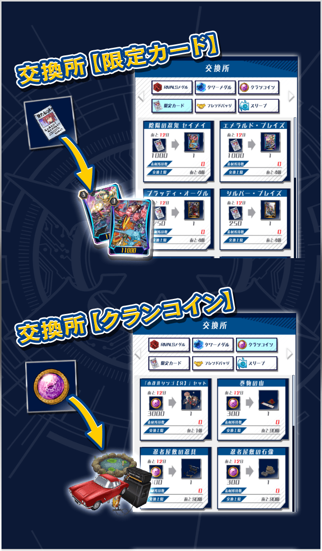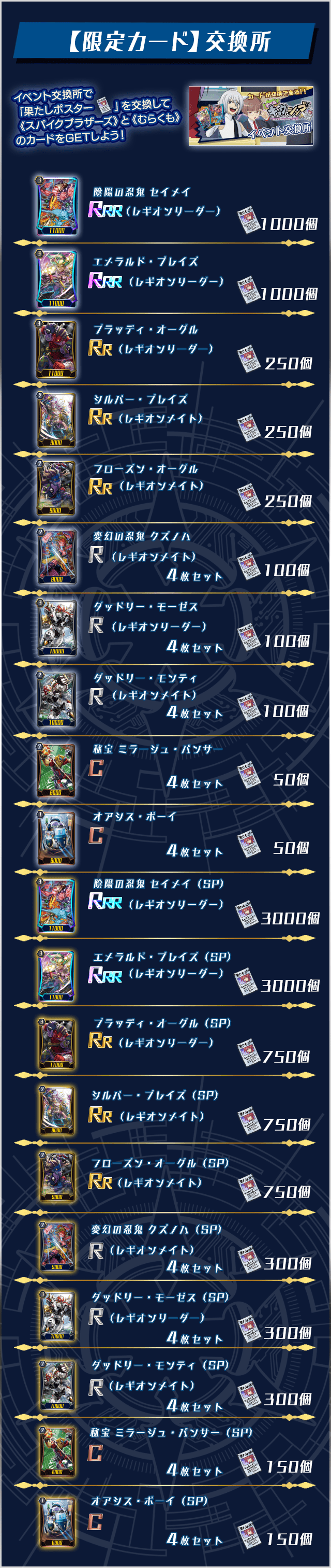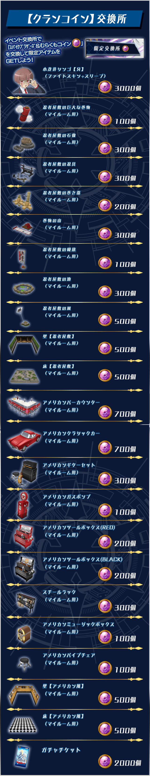 【限定カード】交換所では「果たしポスター」と引き換えに今回新規で追加される《スパイクブラザーズ》と《むらくも》の限定カードが獲得できます。また、【クランコイン】交換所では「スパイクブラザーズ&むらくもコイン」と引き換えにマイルーム家具が獲得できます。